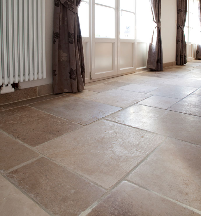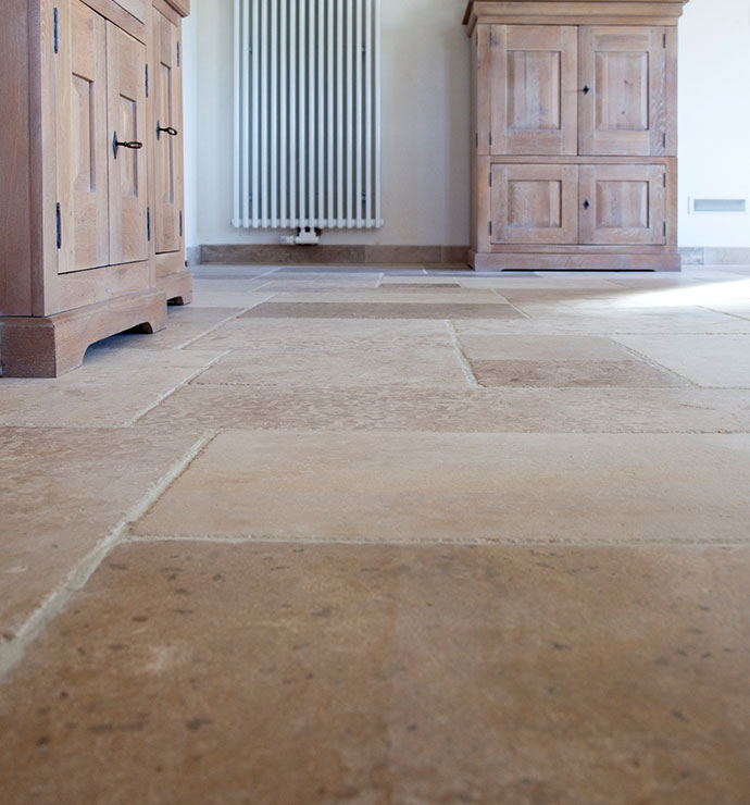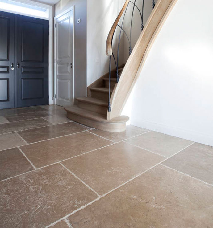 Bodenplatten wie in französichen Schlösser oder Flagstones wie auf Sylt. Diese Natursteinfliesen aus qualitativ hochwertigem Limestone werden seit Jahrhunderten für herschafftliche Atmosphären verwendet.