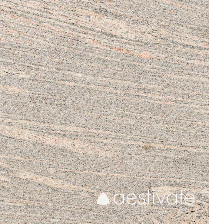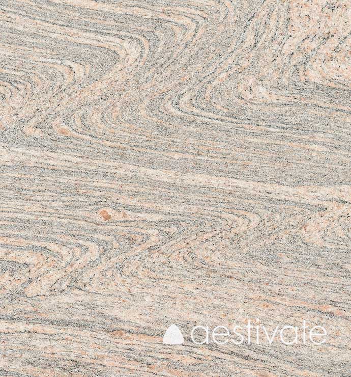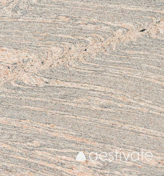Der Juparana Colombo mit einer satinierten Oberfläche ist für seine grau-rosafarbene, stark verfaltete Oberfläche bekannt und stammt aus dem präkambrischen Zeitalter. Er besteht aus intensiv verfalteten Schichten von mittel- bis grobkörnigem Neosom und feinkörnigem, grauem Paläosom. Diese Eigenschaften verleihen dem robusten Granit seinen charakteristischen Wiedererkennungswert. Juparana Columbo, auch bekannt als Jup Colombo, ist ein indisches Gestein, das sich aufgrund seiner vielfältigen Erscheinung von anderen abhebt und Ihrem Zuhause eine besondere Atmosphäre verleiht. Dank seiner warmen Farbe und polierten Oberfläche sorgt dieses Gestein für ein elegantes Wohnambiente und ergänzt warme sowie kühle Farbtöne in Ihrem Wohnraum perfekt.