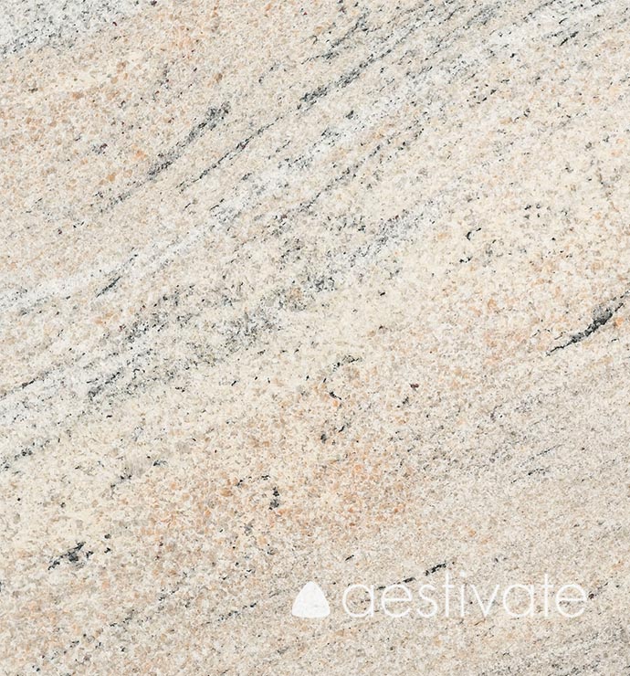 Der Gneis besteht aus einer Matrix von mittelkörnigem, grauem Quarz und hellgrauem Feldspat. Darin sind unregelmäßig hellbeigefarbene bis rosafarbene etwas gröbere Feldspäte fein verteilt oder in flaserig ausgebildeten Agglomeraten konzentriert. In beiden Komponenten sind schwarze feinschuppige Biotite unregelmäßig verteilt oder in mm-feinen nicht aushaltenden Lagen angeordnet. Der Biotit ist teilweise alteriert und trägt zum beigen Farbton bei. Der intensive Wechsel aller Lagen bilden ein lebhaftes strukturelles und farbliches Dekor. Das Gestein ist dicht und in seinem technischen Verhalten mit Graniten vergleichbar. Die größeren Feldspatlagen sind kratzempfindlich gegen Quarz und Stahl. Intensive Farbdifferenzen durch die wechselnde Anhäufung aller Minerale sind ausgeprägt. Je nach Charge sind Ton-in-Ton-Schwankungen vorhanden. Am Biotit sind im Gegenlicht leichte Öffnungen der Oberfläche möglich.